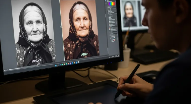 Ключевые задачи: Профессиональная ретушь фотографий, часто старых или поврежденных, для последующей гравировки на камне.