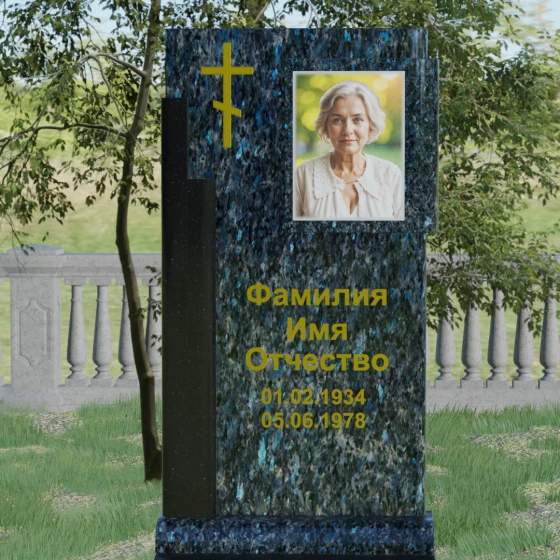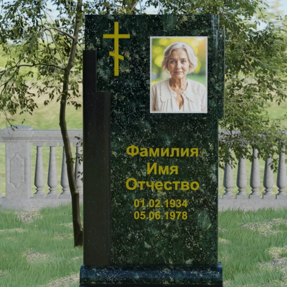 Основой мемориала является вертикальная стела, выполненная в контрастном сочетании двух видов камня, что придает памятнику объем и многогранность. В верхней части, по канонам веры, расположен восьмиконечный православный крест. Он выполнен в благородном золотом цвете, который мягко сияет на темном фоне, символизируя свет надежды и духовную чистоту. Справа от креста расположена уникальная деталь — интегрированная в основное полотно каменная рамка для портрета. Она выполнена из контрастного минерала с богатой зернистой текстурой, что создает визуальный акцент на образе дорогого человека, словно бережно обрамляя память о нем в вечный камень.