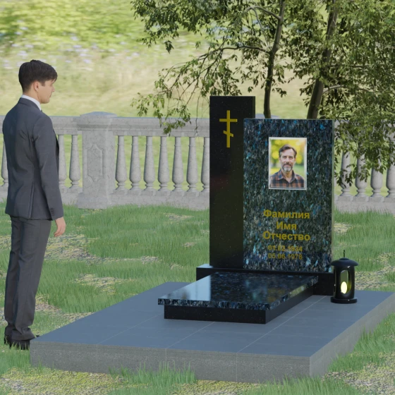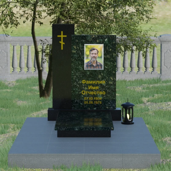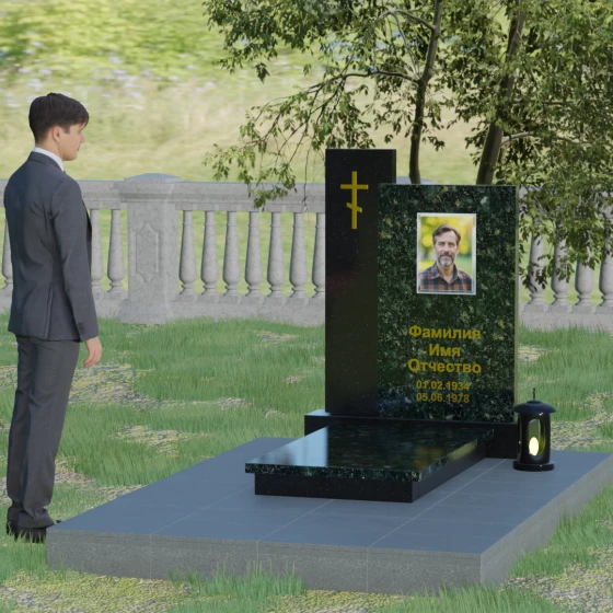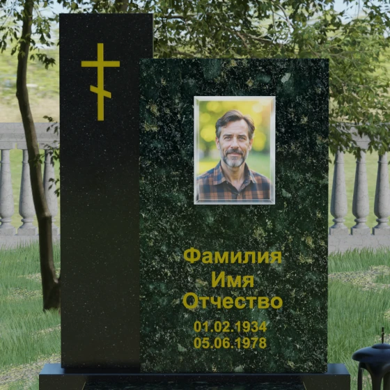 Визуальное решение данного мемориала строится на благородном контрасте двух вертикальных элементов, что позволяет создать глубокий и многогранный художественный образ. Композиция состоит из двух стел разной высоты, установленных внахлест. Более высокая и узкая стела служит духовным стержнем комплекса: на её полированной поверхности закреплен лаконичный православный крест. Его строгие линии и золотистое покрытие подчеркивают святость места и символизируют надежду на вечную жизнь. Широкая основная панель выступает в качестве смыслового центра, где располагается портрет и основные памятные надписи. Использование фотокерамики или портрета на стекле в специальной нише придает образу особую четкость и глубину, гармонируя с зеркальной поверхностью камня.