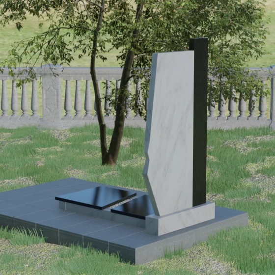 Данная мемориальная композиция — это торжество современной архитектурной мысли, воплощенное в благородном граните. Выбор этой модели обусловлен её уникальной асимметричной геометрией, которая выделяет захоронение на фоне типовых решений. Комбинированное исполнение из двух контрастных видов камня позволяет создать глубокий визуальный акцент: вертикальная колонна из насыщенного красного гранита символизирует духовную опору и жизненную энергию, в то время как основная стела из глубокого черного камня олицетворяет вечный покой и скорбь. Надгробие из натурального камня такой формы выглядит монументально и одновременно изящно благодаря сложной огранке. Правая грань основной стелы дополнена характерным скосом и ступенчатым вырезом, что придает изделию динамику и многогранность. Особое внимание уделено игре света и тени на полированных поверхностях: зеркальный блеск черного гранита отражает небо, создавая эффект глубины, а матовые фаски подчеркивают строгость и чистоту линий архитектурного ансамбля.