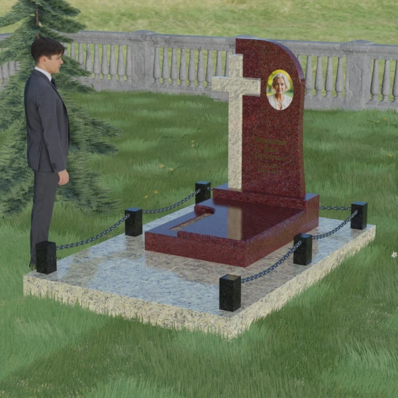 Правая часть стелы — это широкое каменное полотно с мягким, плавным изгибом в верхней части, напоминающим небесный свод или церковный купол. Контраст между прямолинейностью креста и текучестью основной плиты создает уникальный художественный ритм. Боковые грани и верхушка изделия отполированы до зеркального блеска, в котором отражается небо, в то время как глубокая гравировка текста и портрета в овальной нише подчеркивают индивидуальность монумента. Особую массивность конструкции придает основание — монумент возведен на высокий гранитный цоколь. По периметру установлены монументальные столбики с декоративными фасками, соединенные массивными цепями, что создает защищенный контур и атмосферу уединенного покоя.