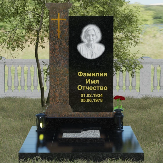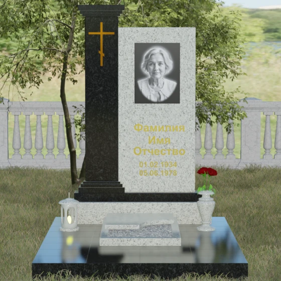 Композиция данного надгробия построена на гармоничном сочетании двух вертикальных элементов, установленных на массивное ступенчатое основание. Левая часть выполнена в виде величественной колонны с декоративным навершием в классическом стиле. На фронтальной стороне колонны расположена гравировка православного креста, покрытая сусальным золотом или имитирующим его составом, что придает мемориалу торжественный и одухотворенный вид. Правая часть — это лаконичная прямоугольная стела, предназначенная для размещения портрета и памятных надписей. Строгая геометрия линий подчеркивает внутреннюю силу и достоинство того, чья память здесь увековечена.