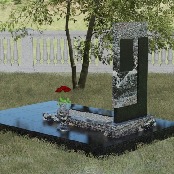 Данная модель мемориала представляет собой торжество современной архитектурной мысли, выраженное в строгой геометрии и выверенных пропорциях. Это надгробие из натурального камня привлекает внимание своим асимметричным, но идеально сбалансированным дизайном. Композиция строится на гармоничном сочетании двух Г-образных блоков, которые словно «входят» друг в друга, символизируя неразрывную связь, единство и завершенность жизненного пути. Вертикальная ориентация стелы подчеркивает стремление вверх, а безупречно прямые углы и острые грани придают монументу монументальность и благородство. Отсутствие лишнего декора компенсируется богатством фактуры: идеально зеркальная полировка основной плоскости контрастирует с матовой глубиной боковых срезов, создавая эффектный визуальный объем.