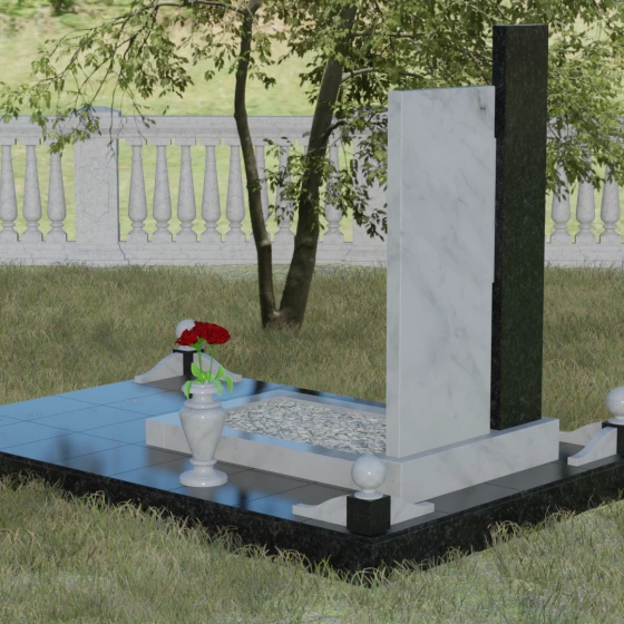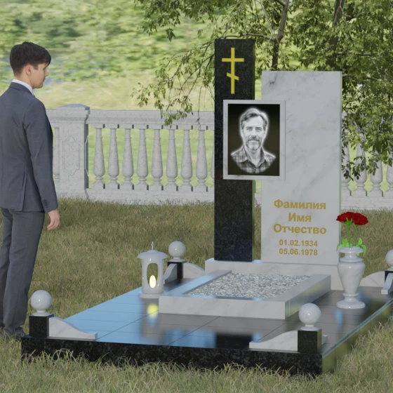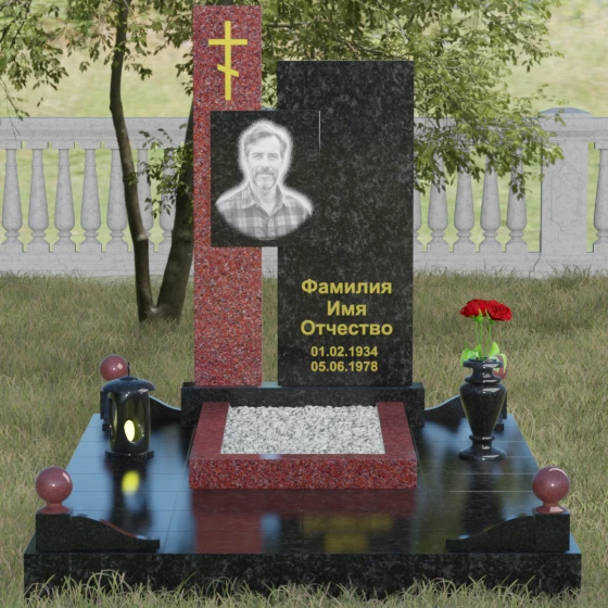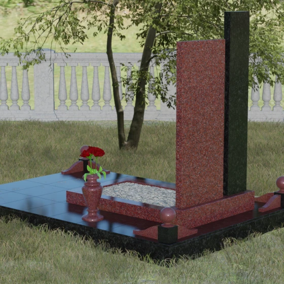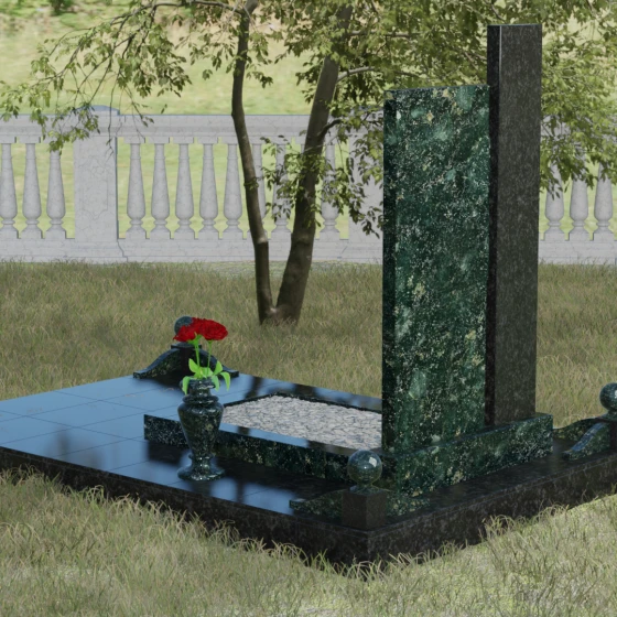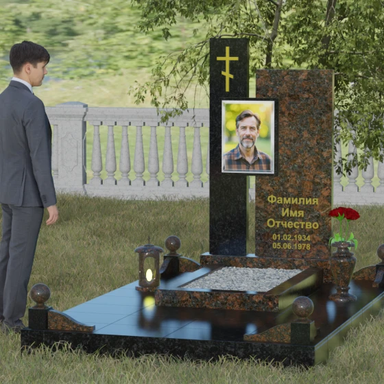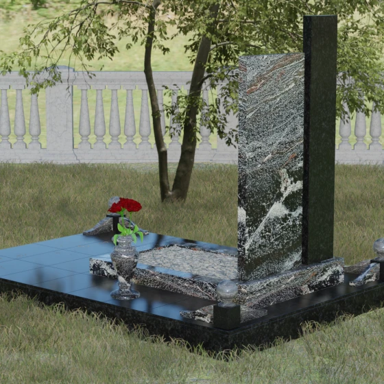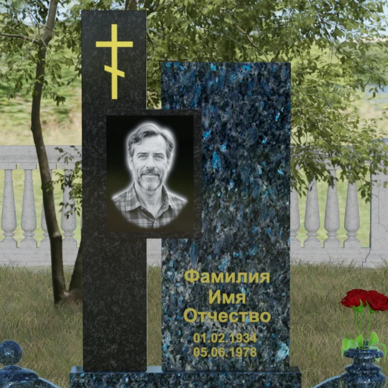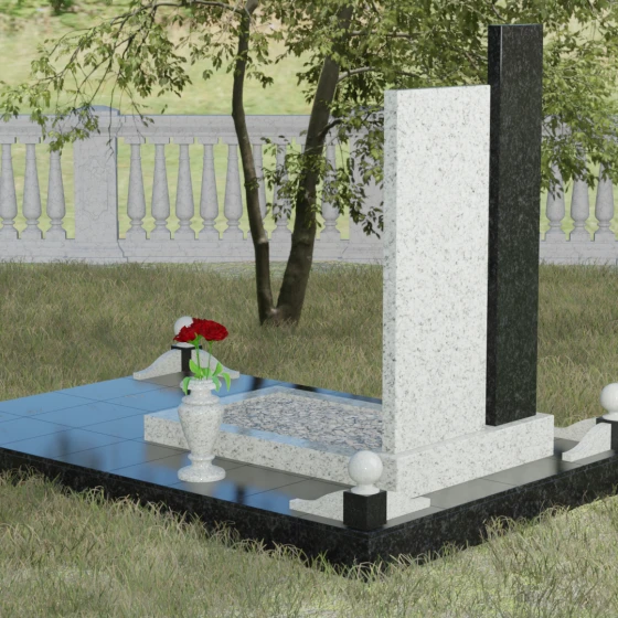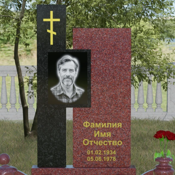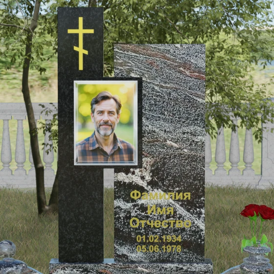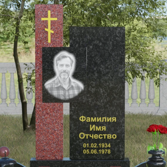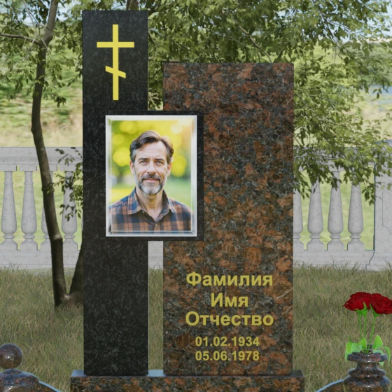 Данное ритуальное изделие представляет собой подлинный образец современного мемориального искусства, в котором строгость архитектурных форм гармонично сочетается с глубоким философским подтекстом. Композиция выстроена на изящном сопоставлении двух вертикальных стел, имеющих разную высоту и фактуру. Асимметричное исполнение символизирует многогранность человеческой жизни: её взлеты и земное завершение. Высокая зеркально-черная стела воплощает собой бесконечность космоса и тишину вечного сна, в то время как примыкающий к ней цветной элемент из благородного камня привносит в ансамбль теплоту земных воспоминаний. Плавные переходы между гранями и безупречная полировка создают ощущение текучести времени, которое застыло в камне, оберегая вечный покой усопшего.