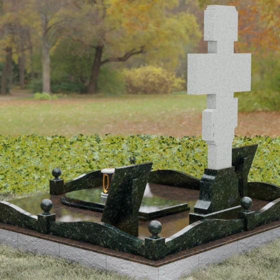 Особое внимание в этой модели уделено геометрии и пластике линий. Плавные изгибы цоколя и волнообразные формы боковых стел символизируют бесконечность жизненного пути и тихую гавань вечного упокоения. Эти мягкие переходы лишают монумент излишней суровости, превращая его в изысканный мемориальный объект, который гармонично вписывается в ландшафт, создавая атмосферу умиротворения и высокого стиля.