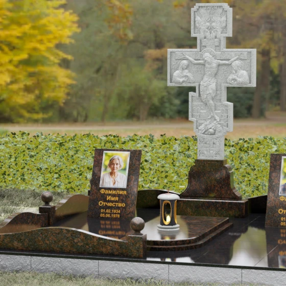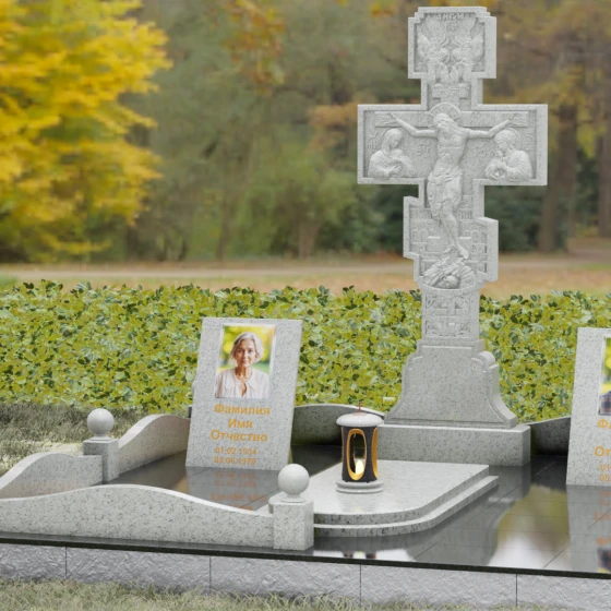 Данный мемориальный ансамбль представляет собой совершенный баланс между духовными традициями и современной архитектурной эстетикой. В центре композиции находится величественная стела в форме высокого православного креста, украшенного детальной многоуровневой резьбой. Барельефное изображение Распятия, выполненное с глубокой проработкой каждой детали — от складок плащаницы до ликов предстоящих, — создает ощущение покоя и благодати. Светлая, матовая фактура резного камня эффектно контрастирует с зеркально отполированными боковыми элементами, предназначенными для увековечивания памяти близких.