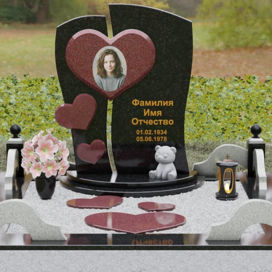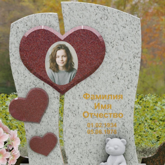 Оформление: Уникальная геометрия этого надгробия сама подсказывает идеальное расположение гравировки. Крупное центральное сердце словно создано для размещения портрета — здесь он будет главным смысловым акцентом, защищенным символом любви. Правую, более широкую часть плиты, рекомендуется использовать для нанесения Фамилии, Имени, Отчества и дат жизни. Здесь же останется достаточно места для проникновенной эпитафии или дополнительного декоративного элемента, например, небольшой виньетки или креста.