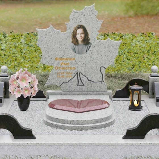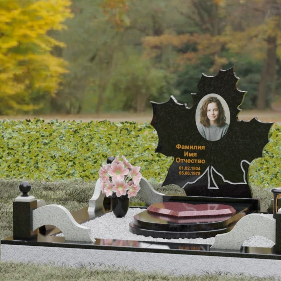 Данная мемориальная композиция — это воплощение глубокого уважения и вечной памяти, облаченное в художественную форму. Выбор формы кленового листа не случаен: в мировой символике он олицетворяет силу духа, красоту жизненного пути и мудрость. Каждая линия этой стелы пропитана эстетикой природного изящества. Резные края листа выполнены с филигранной точностью, создавая сложный, многогранный силуэт, который выделяется на фоне классических строгих форм. Плавные изгибы и отсутствие агрессивных углов призваны дарить чувство покоя и умиротворения, подчеркивая, что душа близкого человека обрела вечный приют в гармонии.