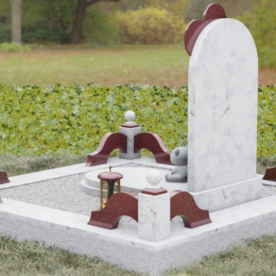 Представленная мемориальная композиция — это не просто надгробие, а глубокое художественное высказывание, в котором застыло мгновение нежности и вечной связи. Основная стела выполнена в форме изящной асимметричной арки из глубокого черного гранита. Главным акцентом ансамбля выступает объемное сердце из насыщенного красного камня, которое словно парит в воздухе, подобно легкому воздушному шару. Тонкая, едва уловимая линия резьбы соединяет этот символ любви с рукой выгравированного силуэта маленькой девочки. Мастерски исполненная гравировка ребенка с хвостиком, тянущегося вверх, придает всей конструкции невероятную легкость и трогательность. Игра контрастов здесь возведена в абсолют: зеркальная полировка черного обелиска соседствует с ярким цветом сердца, создавая эффект трехмерного пространства и визуального объема.