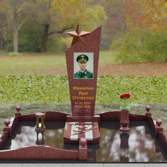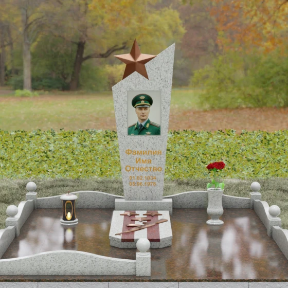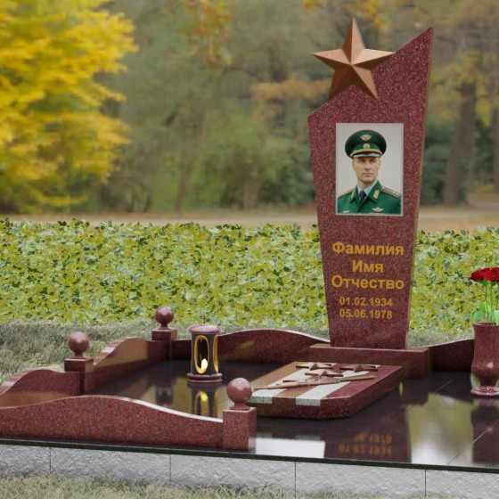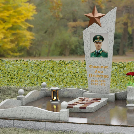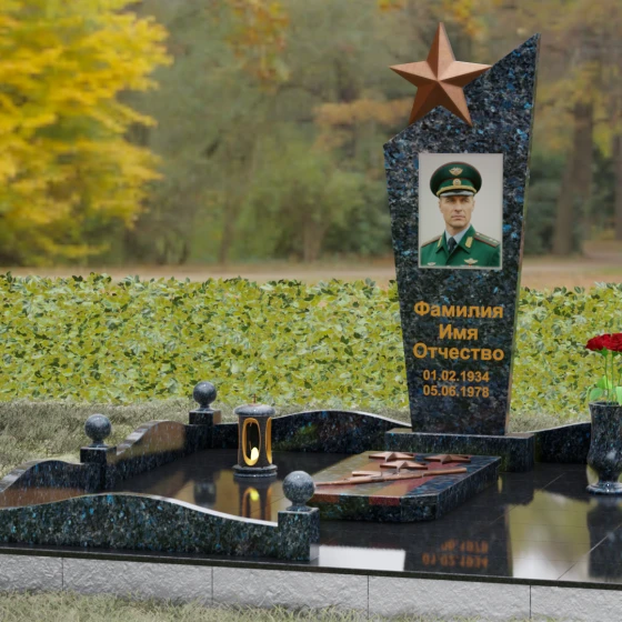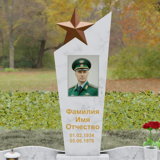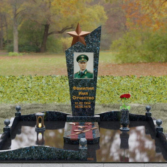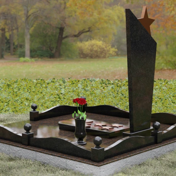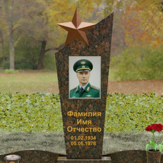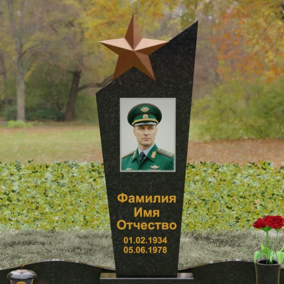 Основу композиции составляет массивное каменное полотно с уникальной асимметричной геометрией. Верхний край обелиска уходит в резкий диагональный подъем, создавая динамичный силуэт, устремленный к небесам. Венчает эту вершину объемная пятиконечная звезда — символ, выполненный в теплом бронзовом оттенке, который эффектно контрастирует с основным цветом камня. Зеркальная полировка лицевой грани доведена до эталонного блеска: поверхность буквально оживает, отражая окружающий мир и создавая глубину, в которой запечатлен портрет. Прямые, строгие линии боковых граней подчеркнуты аккуратными фасками, что придает всей конструкции архитектурную завершенность и визуальную легкость при сохранении колоссальной физической прочности.
