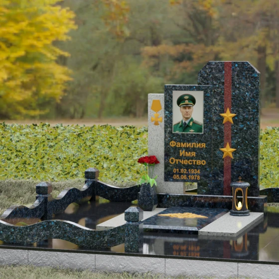 Выбор мемориального комплекса — это всегда поиск баланса между строгостью формы и глубиной чувств. Модель Артикул 201 представляет собой сложную архитектурную композицию, которая идеально подходит для увековечивания памяти сильного, волевого человека, посвятившего жизнь служению. Надгробие из натурального камня состоит из трех вертикальных элементов, создающих динамичный, ступенчатый силуэт. Центральная стела, предназначенная для размещения портрета и основной информации, обрамлена боковыми пилонами из контрастного красного гранита. Такая геометрия символизирует устойчивость, надежную опору и непоколебимость духа. Сочетание строгих прямых линий и аккуратных фасок на вершинах придает памятнику торжественный, парадный вид, подчеркивая заслуги и особый статус усопшего.