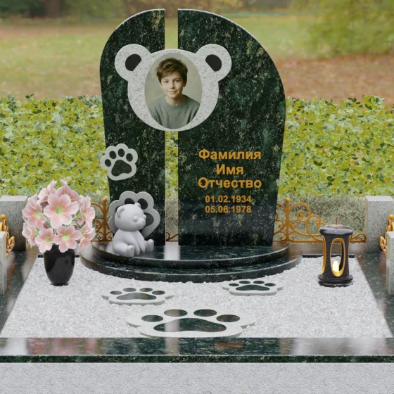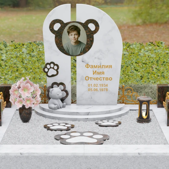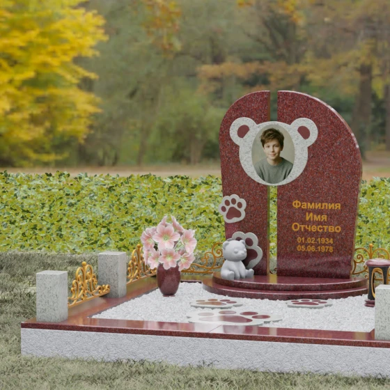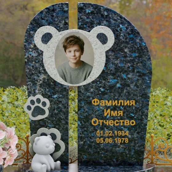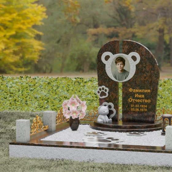 Композиция данного мемориала поражает своей уникальной архитектурой. Центральное вертикальное полотно разделено на две симметричные части узким вертикальным просветом, что создает ощущение легкости и устремленности ввысь, несмотря на внушительный вес камня. Главным художественным акцентом является медальон в верхней части, выполненный в виде стилизованной головы медвежонка. Портрет обрамлен светлой вставкой из благородного гранита, которая выступает над основной плоскостью, создавая эффект мягкого свечения вокруг лика.