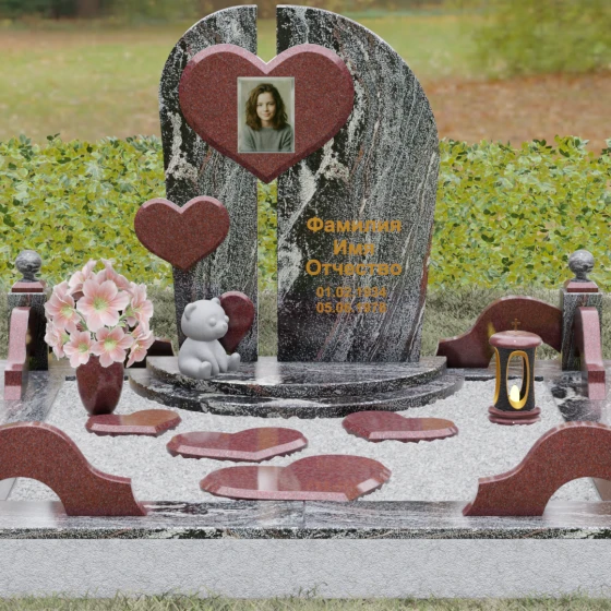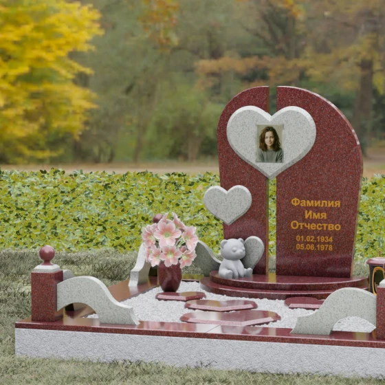 Визуальная концепция модели строится на гармоничном сочетании двух асимметричных вертикальных стел, выполненных из темного камня с безупречной зеркальной полировкой. Центральным элементом композиции является объемное сердце из контрастного красного гранита, которое словно объединяет две половины памятника. В его центре располагается портрет, обрамленный тонкой фаской, что создает эффект драгоценного медальона. Дополнительный акцент вносит второе, меньшее по размеру сердце, закрепленное на левой части стелы, что добавляет динамики и многослойности художественному образу.