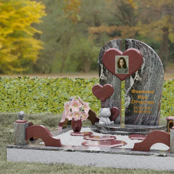 Каждая линия этой модели наполнена глубоким смыслом. Разделенная на две части стела символизирует границу между двумя мирами, а объединяющее их сердце — торжество любви над временем и забвением. Фигура медвежонка у подножия — символ чистоты, беззащитности и невинной души, что часто выбирают для оформления захоронений самых дорогих и рано ушедших близких. Использование контрастных цветов камня подчеркивает многогранность человеческой жизни, где есть место и глубокой скорби, и светлым воспоминаниям. Этот памятник не просто обозначает место покоя, он рассказывает историю глубокой привязанности, которая не исчезает с годами.