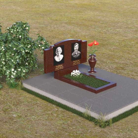 Этот гранитный монумент представляет собой композицию, где каждая деталь продумана до мелочей. Верхняя часть памятника имеет фигурную форму с плавными, волнообразными очертаниями, словно застывшая мелодия скорби. Верхний край обработан таким образом, что создает впечатление легкой, воздушной драпировки. Боковые грани аккуратно скруглены, смягчая строгость камня и придавая ему более изящный вид. Фаски, снятые по периметру, подчеркивают контур и добавляют выразительности. Лицевая поверхность отполирована до зеркального блеска, отражая свет и создавая ощущение глубины. На полированной поверхности выгравированы портреты усопших и памятные надписи, выполненные с особой тщательностью и вниманием к деталям. Под основной плитой располагается горизонтальная плита, также выполненная из черного гранита, создающая дополнительный уровень и подчеркивающая монументальность композиции. На ней размещена еще одна полированная плита, но уже меньшего размера, как символ нерушимости и продолжения рода.