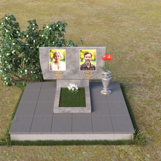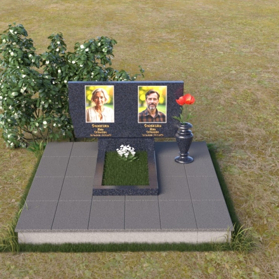 Это ритуальное изделие представляет собой гармоничное сочетание прямых линий и мягких, едва уловимых изгибов, создающих ощущение покоя и умиротворения. Стела имеет прямоугольную форму, но ее верхняя грань слегка скошена, что придает ей визуальную легкость и динамику. Обратите внимание на зеркальную полировку лицевой стороны – она отражает небо и окружающий мир, словно заключая в себе вечность. На полированной поверхности выгравированы портреты усопших и памятные надписи, выполненные с высокой точностью и детализацией. Слева от стелы, на основании, располагается небольшая горизонтальная плита с аналогичной полировкой, создающая дополнительное пространство для цветов или памятных предметов. Основание памятника выполнено из серого камня с матовой фактурой, что создает контраст с блестящей стелой и придает композиции устойчивость и завершенность. Рядом с плитой установлена ваза, выполненная из того же черного полированного гранита, что и стела, что обеспечивает единство стиля и служит достойным обрамлением для живых цветов, символизирующих вечную память.