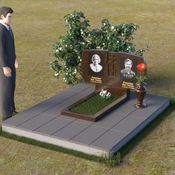 Геометрия модели тщательно продумана. Верхняя часть стел имеет скругленные углы, смягчающие строгость линий и придающие композиции более человечный облик. Между портретами выгравирован лаконичный православный крест, напоминающий о духовности и вере. Основание стел переходит в горизонтальную плиту, образуя единую плоскость с надгробной плитой. Надгробная плита выполнена в виде прямоугольника с полированной поверхностью, отражающей небо и окружающий мир. У основания композиции располагается аккуратная ваза из черного гранита, предназначенная для живых цветов, как символ непреходящей любви и уважения.