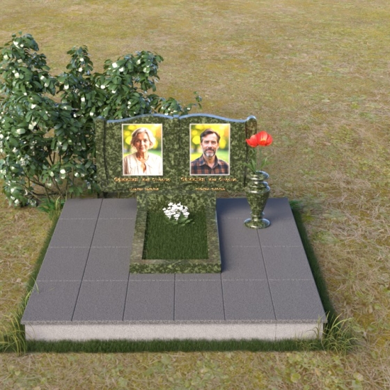 Ритуальное изделие ПГ036 представляет собой сдержанную, но исполненную достоинства композицию, созданную для сохранения памяти о близких. Два прямоугольных элемента стелы, соединенные вместе, образуют волнистый верх, напоминающий раскрытую книгу судеб. Грани обеих частей искусно обработаны, создавая мягкий, обтекаемый силуэт. Зеркальная полировка черного гранита служит идеальным фоном для гравировки портретов и надписей, словно запечатлевая светлые воспоминания в вечном камне. Слева и справа, в верхней части стелы, вырезаны лаконичные кресты, символизирующие веру и надежду. Тонкие линии врезаются в полированную поверхность, создавая игру света и тени, и добавляя глубину изображению. Горизонтальная плита, расположенная перед стелой, выполнена из того же черного гранита с зеркальной полировкой, отражая небо и окружающий пейзаж, создавая ощущение легкости и воздушности. Вместе с тем, основание памятника выполнено из серого камня, что придает всей композиции устойчивость и основательность.