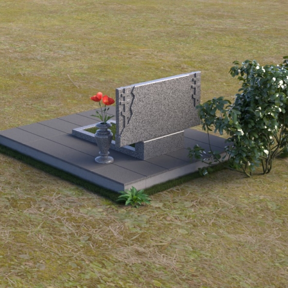 Мемориальная композиция ПГ140 представляет собой лаконичное и в то же время выразительное решение. Основной элемент – вертикальная стела из полированного гранита, увенчанная резным крестом в верхней левой части. Крест выполнен в строгой, геометрической форме, символизирующей веру и духовность. Его грани четко очерчены, а полированная поверхность переливается на солнце, создавая ощущение света и надежды. Боковые грани стелы имеют неровную, словно сколотую фактуру, что придает композиции особую выразительность и естественность. Контраст между зеркальной полировкой основной поверхности и матовой текстурой боковин акцентирует внимание на деталях и создает игру света и тени. Нижняя часть стелы переходит в горизонтальную плиту, также выполненную в черном полированном граните. Ее зеркальная поверхность отражает небо и окружающий пейзаж, создавая эффект глубины и бесконечности. Рядом со стелой расположена элегантная ваза из черного гранита, предназначенная для живых или искусственных цветов. Ее классическая форма и полированная поверхность гармонично дополняют общую композицию.