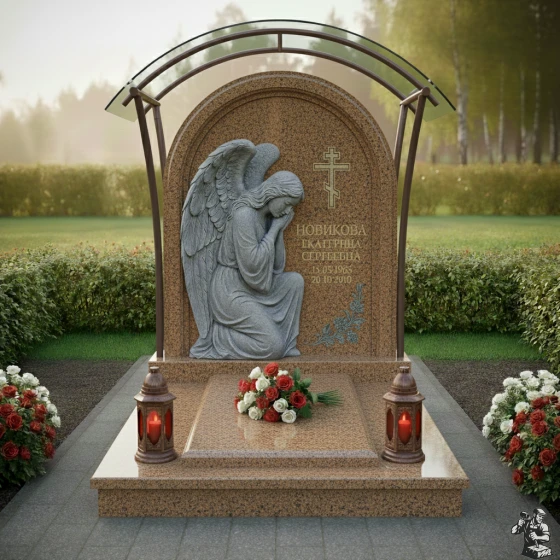 Плавные изгибы стелы, напоминающие мягкую волну, символизируют жизненный путь, его изменчивость и в то же время неизбежное движение к покою. Форма арки, обрамляющая фигуру ангела, ассоциируется с небесным сводом, защитой и переходом в иной мир. Скорбящий ангел – это мощный символ утешения, защиты и веры в бессмертие души. Он олицетворяет присутствие высших сил, оберегающих усопшего и дарующих покой его близким. Цветочная гравировка в нижней части стелы служит напоминанием о быстротечности жизни и ее красоте, а крест – о христианской вере и надежде на вечную жизнь. Вся композиция наполнена глубоким смыслом, призывая к осмыслению и принятию неизбежности, но при этом даруя утешение и надежду.