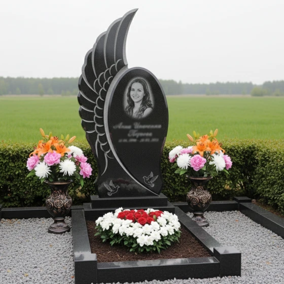 Центральным элементом комплекса является стела, выполненная в уникальной асимметричной форме, напоминающей распахнутое крыло ангела или взлетающую птицу, символизирующую вознесение души и безмятежный покой. Одна сторона стелы имеет строгую вертикальную линию, тогда как другая плавно изгибается вверх, создавая ощущение легкости и устремленности. Эта динамичная форма, лишенная острых углов, передает идею непрерывности жизненного пути и перехода в иное измерение. Грани стелы тщательно отполированы, что придает камню зеркальный блеск и глубину, в то время как внутренняя часть "крыла" украшена объемной резьбой, имитирующей перья. Эта резьба создает игру света и тени, подчеркивая естественную фактуру камня и придавая композиции дополнительный объем и выразительность. На лицевой стороне стелы, в верхней части, выгравирован овальный портрет, обрамленный тонкими линиями, а ниже — информация о покойном, выполненная изящным шрифтом. В нижней части стелы расположена гравировка двух летящих голубей — вечного символа мира, чистоты души и небесного покоя, что еще больше усиливает эмоциональное воздействие мемориала.
