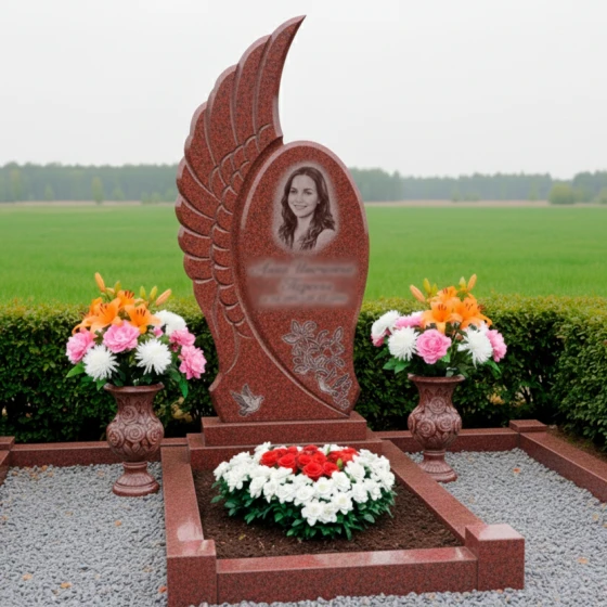 Кому подойдет: Этот мемориальный комплекс идеально подойдет для тех, кто ищет не просто памятник, а уникальное произведение искусства, способное глубоко и трогательно выразить светлую память о близком человеке. Его плавные, обтекаемые формы и символика крыла делают его особенно подходящим для увековечивания памяти о женщинах, чья жизнь была наполнена нежностью, грацией и духовностью. Мемориал станет достойным символом вечного покоя и возвышенной памяти, отражая индивидуальность и значимость ушедшего. Возможность выбора из 8 цветовых решений — 7 видов гранита (гранит амфиболит, гранит Балтик грин, гранит Блю Перл, гранит Габбро-диабаз, гранит Дымовский, гранит Лезниковский, гранит Мансуровский) и 1 вид мрамора (мрамор Тассо) — позволяет подобрать камень, который наиболее точно соответствует характеру и предпочтениям усопшего, создавая по-настоящему персонализированный и глубоко символичный мемориал.