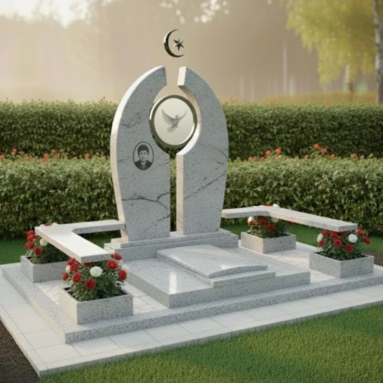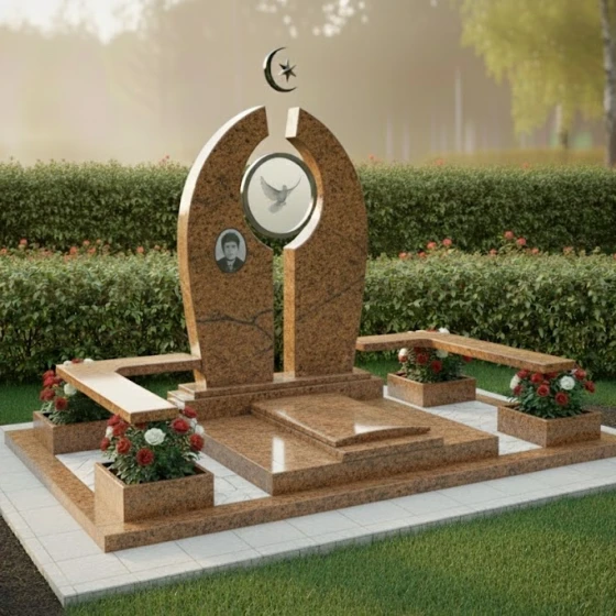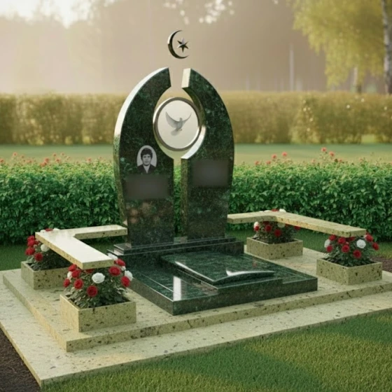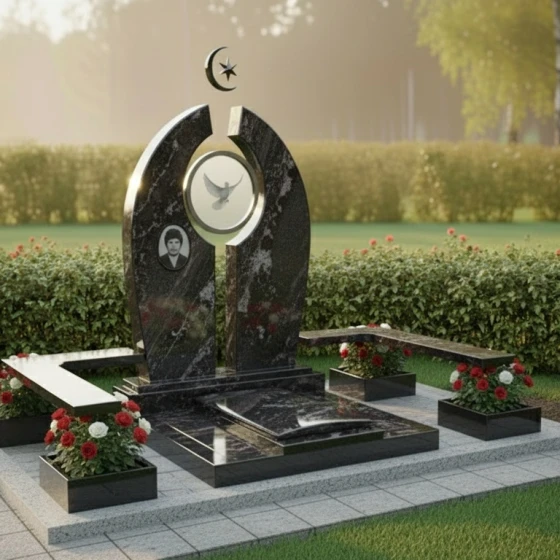 В основе композиции лежит впечатляющая стела, выполненная в уникальной архитектурной форме, напоминающей раскрытые врата или арку, символизирующую переход и вечность. Ее грани обработаны с особой тщательностью, создавая игру света и тени: идеально отполированные до зеркального блеска фронтальные и боковые поверхности контрастируют с тонкими матовыми срезами, подчеркивающими объем и глубину камня. Центральный элемент стелы — изящная полукруглая арка, увенчанная полумесяцем и звездой, выполненными в объемной резьбе, что придает изделию выразительность и духовное значение.