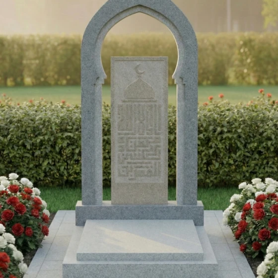 Представляем вашему вниманию модель памятника ПН 506 – это не просто надгробие из натурального камня, а истинное произведение искусства, призванное увековечить светлую память о близком человеке с глубоким почтением и достоинством. Каждая линия, каждый изгиб этого монумента пронизан смыслом и гармонией, создавая ощущение вечности и спокойствия. Центральная стела выполнена в форме изящной арки, напоминающей вход в священное место или портал в иной мир. Ее грани тщательно обработаны, создавая плавные переходы от полированных, зеркальных поверхностей к матовым, словно слегка припорошенным временем, срезам камня. Эта игра контрастов черного и серого гранита придает монументу невероятную глубину и объем, позволяя свету скользить по камню, подчеркивая его благородную текстуру. Внутри арки расположена прямоугольная вставка из светлого гранита, на которой выгравирована сложная каллиграфическая композиция, увенчанная полумесяцем и звездой – символами ислама. Эта гравировка выполнена с поразительной детализацией, где каждый элемент орнамента и каждая буква прорисованы с ювелирной точностью, создавая эффект кружевного узора, который кажется вырезанным из самого камня. Благодаря контрасту светлой гравировки на темном фоне, надпись читается легко и выразительно, притягивая взгляд и приглашая к размышлениям.