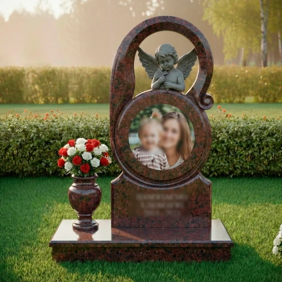 Венчает композицию детально проработанная скульптура ангела-хранителя. Фигура херувима выполнена в технике глубокой резьбы с матовой фактурой, которая эффектно контрастирует с зеркально отполированной поверхностью основного камня. Маленький ангел, склонивший голову в молитвенном смирении, держит в руках лаконичный четырехконечный крест. Каждое перо на его раскрытых крыльях прорезано с исключительной точностью, создавая игру света и тени, которая делает образ живым и объемным. На правой стороне стелы изящно вырезан декоративный завиток-волюта, завершающий динамичный ритм дугообразных линий.