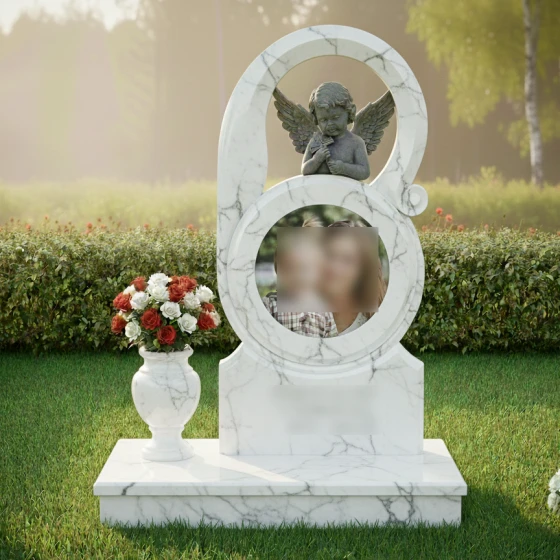 Данная мемориальная композиция поражает сложностью своей геометрии и виртуозностью исполнения резных элементов. В основе дизайна лежит высокая вертикальная стела, силуэт которой напоминает стилизованную цифру восемь или символ бесконечности. Плавные, текучие линии контура создают мягкий, лишенный острых углов образ, что придает мемориалу особую одухотворенность. В центре стелы расположена глубокая круглая ниша, предназначенная для размещения портрета, которая словно обрамлена защитным ореолом камня.