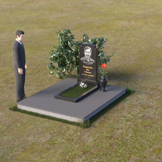 Основной акцент в этой модели сделан на контрасте фактур. Зеркальная полировка черного гранита Габбро-диабаз, из которого выполнена стела, создает эффект бесконечности, отражая небо и окружающий мир. На этом фоне особенно выразительно смотрится гравировка портрета и надписи, выполненные с ювелирной точностью. Нижняя часть стелы, переходящая в горизонтальную плиту, также выполнена из черного гранита, но уже с матовой обработкой, что придает композиции дополнительную глубину и текстуру. Рядом располагается ваза из того же гранита, выполненная в классическом стиле, предназначенная для живых цветов, которые станут символом памяти и любви.