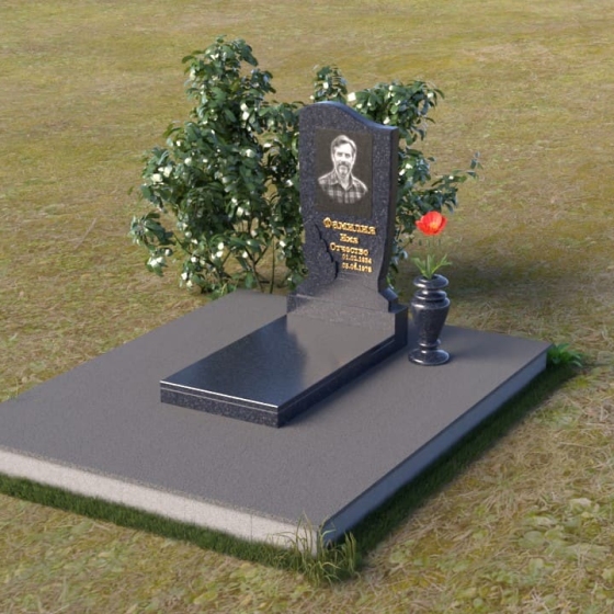 Величественная стела памятника ПВ 015 выполнена в строгой, но элегантной форме. Верхняя часть памятника имеет плавный, волнообразный силуэт, что придает ему мягкость и изящество. Сглаженные углы и отсутствие острых граней создают ощущение покоя и умиротворения. Боковые грани стелы слегка скошены, что визуально облегчает конструкцию и добавляет ей динамичности. Фаска, обрамляющая верхнюю часть памятника, подчеркивает его контур и придает завершенность образу. Нижняя часть стелы, переходящая в тумбу, имеет строгую прямоугольную форму, обеспечивая устойчивость и надежность всей конструкции. Зеркальная полировка поверхности камня отражает окружающий мир, создавая ощущение глубины и света. На стеле располагается портрет усопшего, выполненный с высокой точностью и детализацией, а также памятная надпись, нанесенная золотыми буквами.
