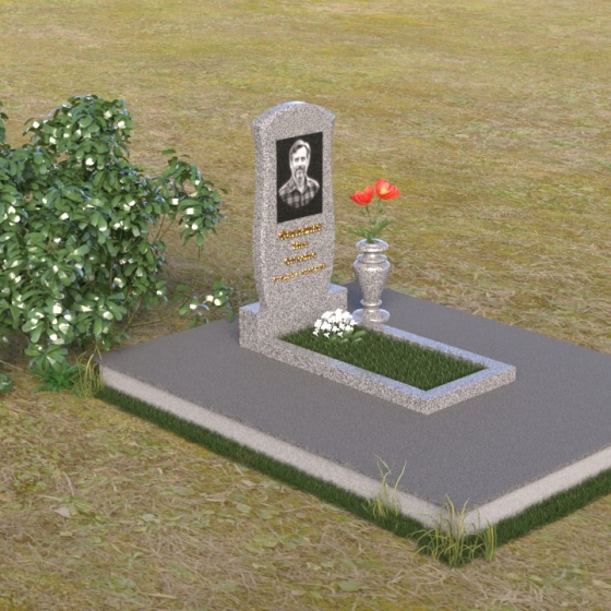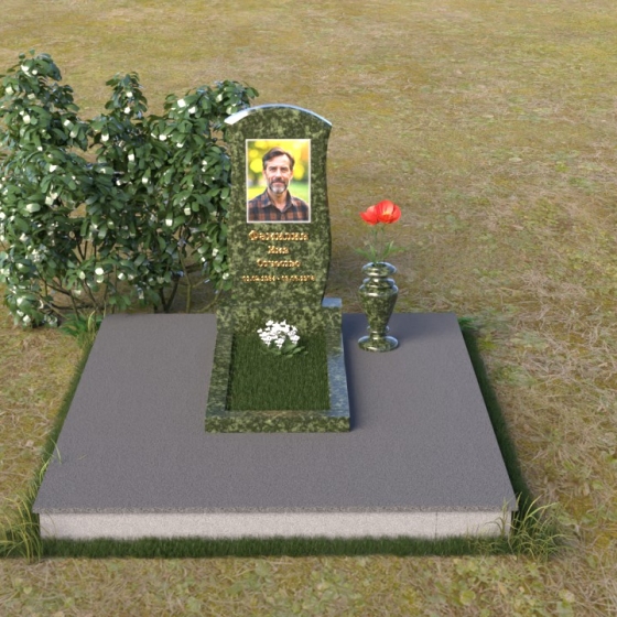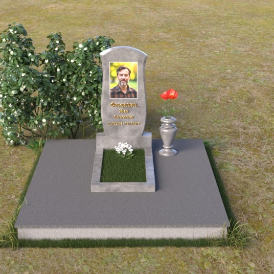 Данная модель предоставляет широкие возможности для индивидуального оформления. Портрет усопшего, выполненный методом гравировки, идеально вписывается в общую композицию, занимая центральное место на стеле. Золотистые буквы надписи, контрастируя с темным фоном полированного гранита, выглядят торжественно и выразительно. Мы рекомендуем выбирать фотографии высокого разрешения для достижения максимальной детализации и реалистичности портрета. Также возможно добавление дополнительных декоративных элементов, таких как эпитафии, религиозные символы или памятные даты. Небольшая подставка, выполненная в том же стиле, что и стела, гармонично дополняет композицию и может служить местом для возложения цветов. Элегантная ваза из черного гранита, расположенная рядом с надгробием, добавляет завершенность образу и позволяет сохранить свежесть цветов на длительное время.